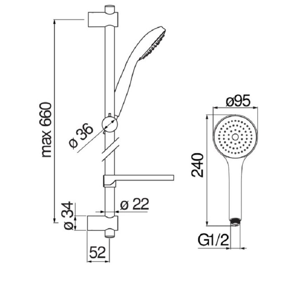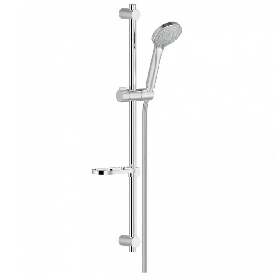 Душевой гарнитур (хром). Скользящий поворотный держатель ручного душа, 3-струйный ручной душ и шланг длиной 150 см, убираемая и регулируемая полка-мыльница.