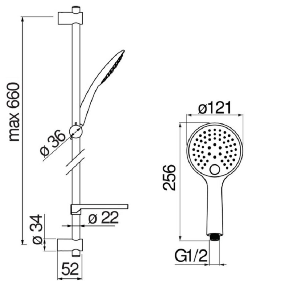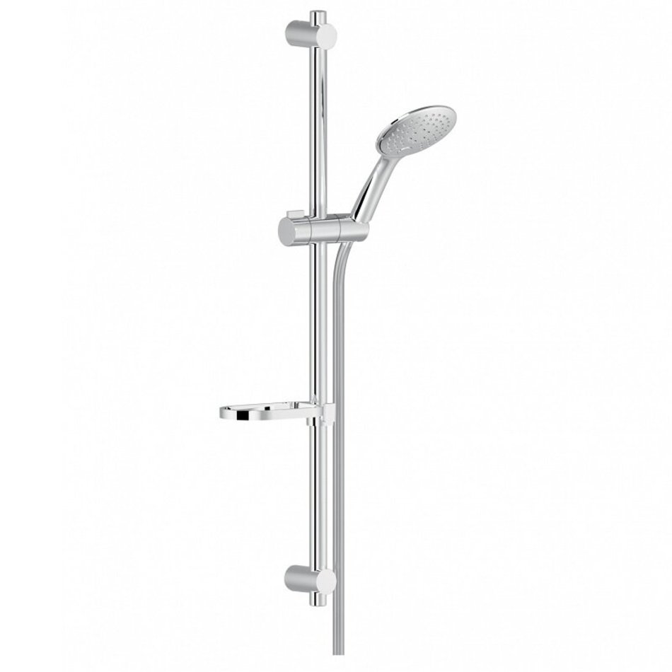 Душевой гарнитур (хром). Скользящий поворотный держатель ручного душа, 3-струйный ручной душ и шланг длиной 150 см, убираемая и регулируемая полка-мыльница. Регулируемое крепление.