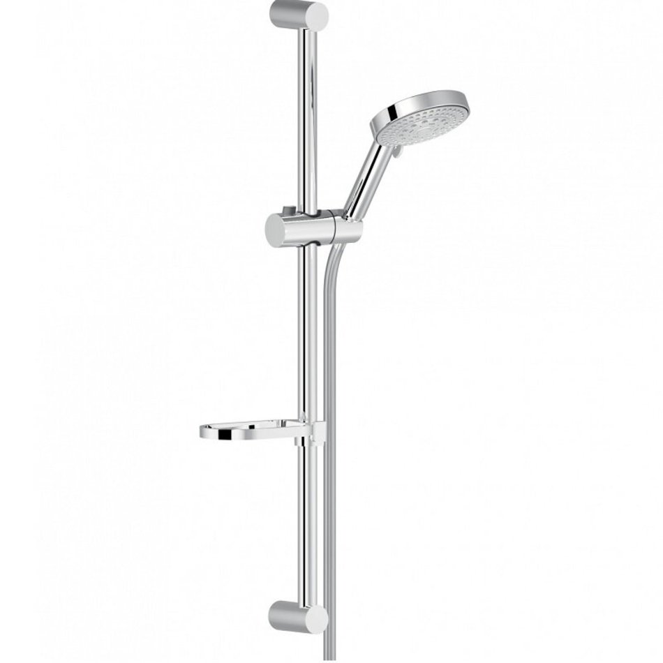 Душевой гарнитур (хром). Скользящий поворотный держатель ручного душа, 5-струйный ручной душ и шланг длиной 150 см, убираемая и регулируемая полка-мыльница.