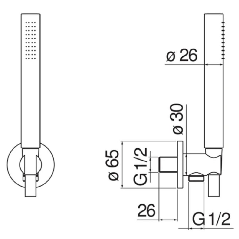 Душевой гарнитур (хром): душ с настенным держателем и водозабором. Соединение воды Ø 1/2”. Неподвижный держатель ручного душа. Одноструйный ручной душ. Шланг длиной 150 см.