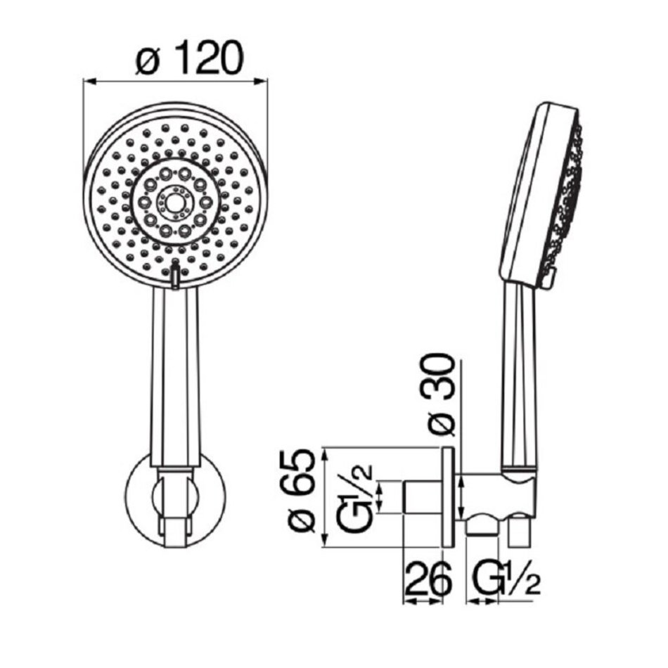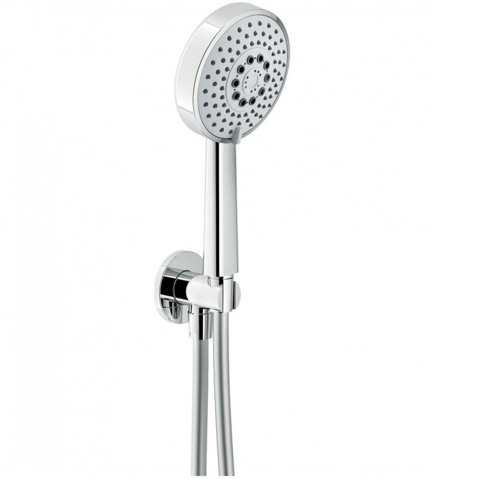 Душевой гарнитур (хром). 1/2” шланговое подключение. Фиксированный держатель для ручного душа. 3-струйный ручной душ и шланг 150 см. Отделка - Chrome.