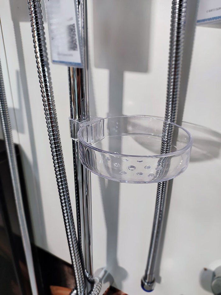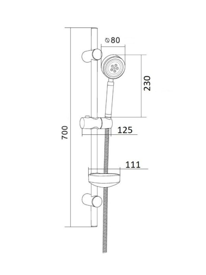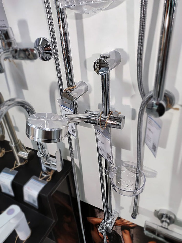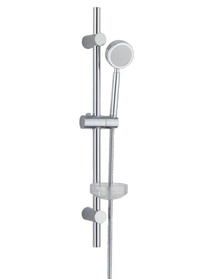 Комплектация: шланг для душа, душевая лейка, душевая штанга, держатель лейки, держатели штанги, мыльница, инструкция