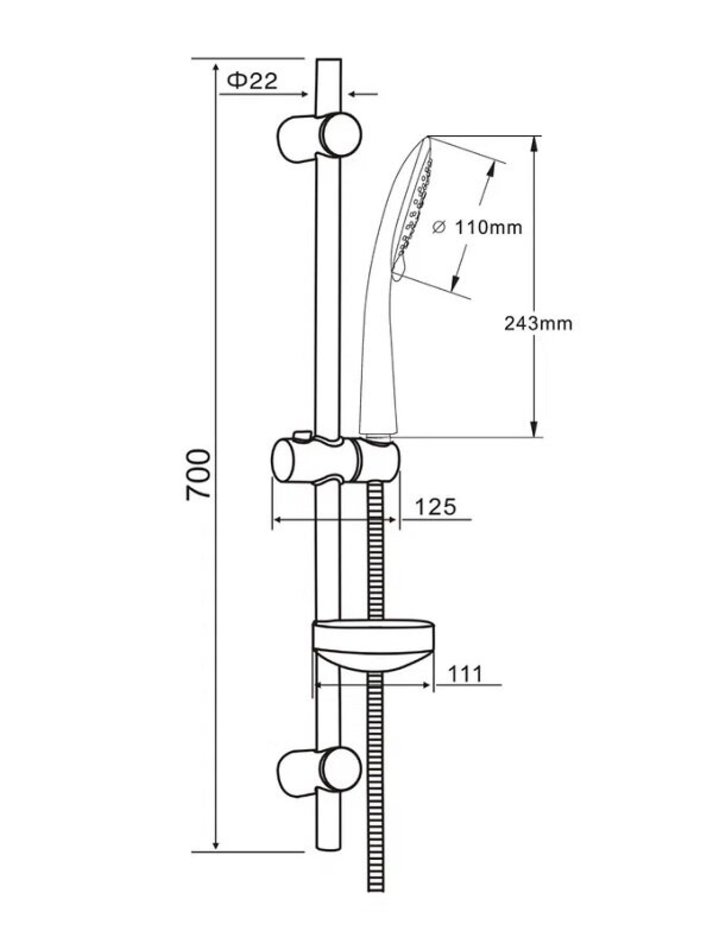 - Держатель ручного душа на штанге с регулировкой угла наклона и по высоте; штанга 700 мм с подвижными держателями (возможность установки в старые отверстия), материал штанги нержавеющая сталь;
