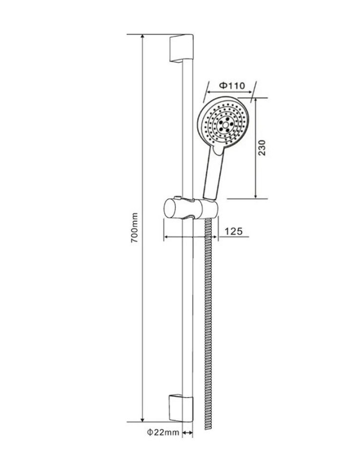 - Шланг для душа, душевая лейка, душевая штанга, держатель лейки, держатели штанги, к-т креплений, инструкция