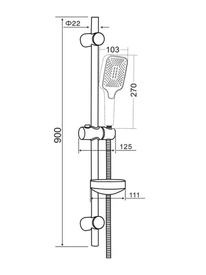 - Шланг для душа, душевая лейка, душевая штанга, держатель лейки, держатели штанги, мыльница, к-т креплений, инструкция