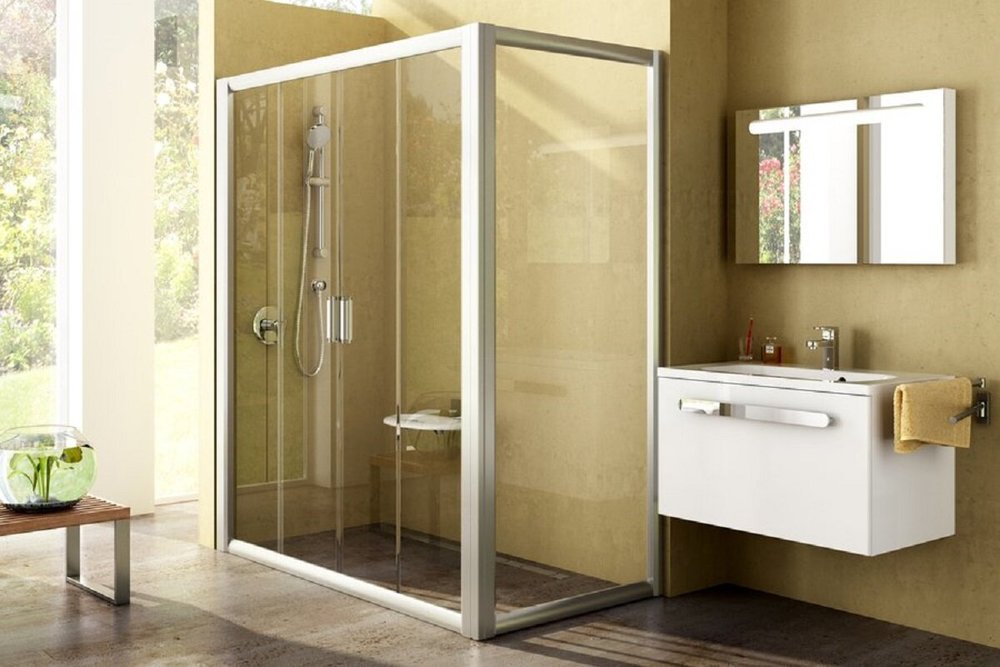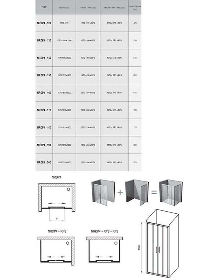 В комплект с дверьми белого цвета входят ручки в исполнении: белый / сатин, с дверьми в цвете сатин — ручки в исполнении хром / сатин. Устанавливается в облицованный кафелем угол ванной комнаты (идеально для облицованной ниши или для комбинации с неподвижной стенкой RPS) на поддоны RAVAK GIGANT PRO, GIGANT PRO FLAT, GIGANT PRO CHROME или непосредственно на пол со встроенным душевым каналом или трапом. Комбинация с двумя неподвижными стенками типа RPS позволяет создать „П“-образный душевой уголок.