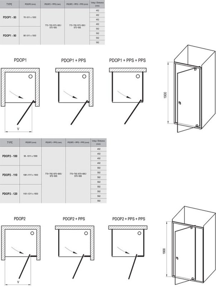 Для комплектации душевого уголка необходимо заказать 2 изделия: душевую дверь PDOP1 или PDOP2 и неподвижную стенку PPS !
