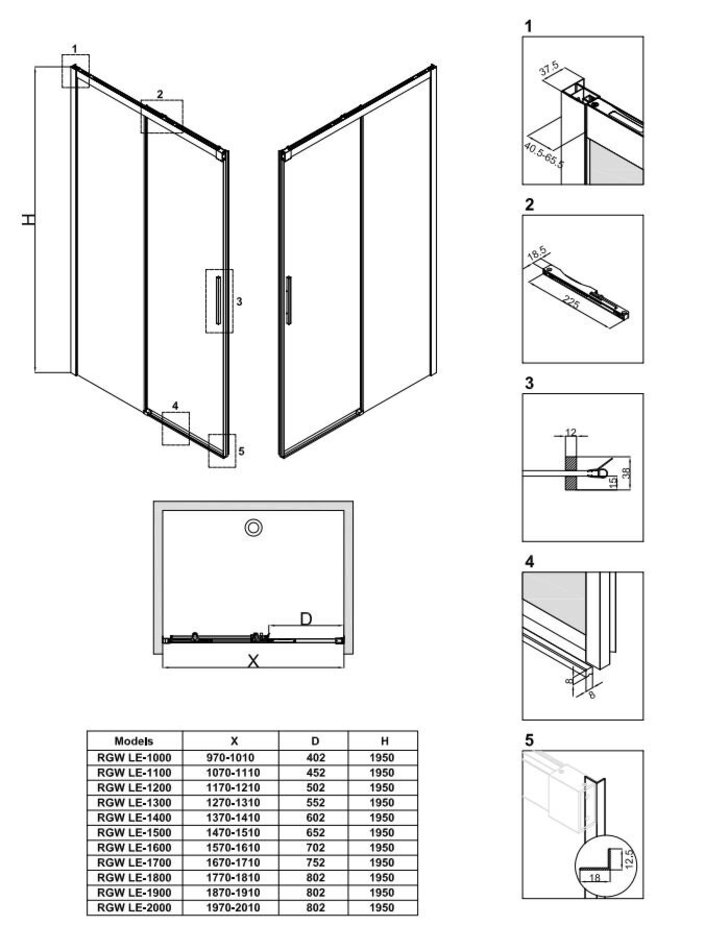Душевая дверь RGW LE-12, 34121210-11, 100 х 195 см, раздвижная, стекло прозрачное, профиль хром