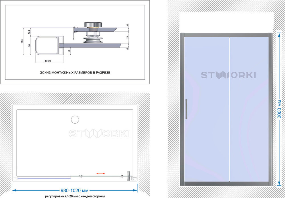 Душевая дверь Stworki Стокгольм DE019D2100200 100 см, раздвижная, профиль черный матовый, стекло матовое, 3GW224TTKK000