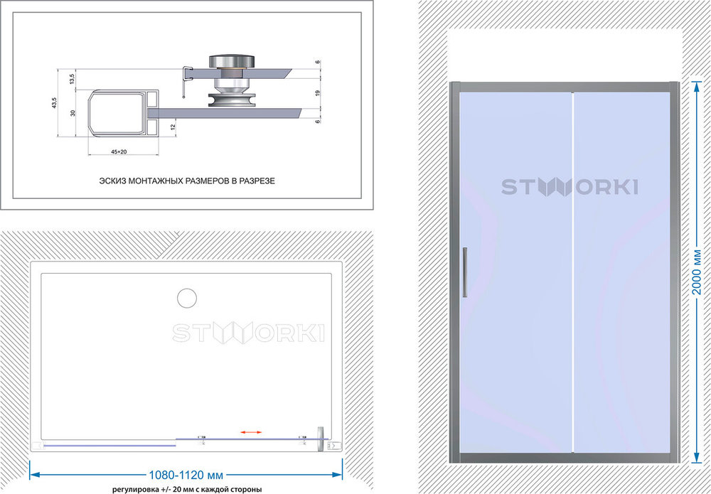 Душевая дверь Stworki Стокгольм DE019D2110200 110 см, раздвижная, профиль хром глянцевый, стекло матовое, 3GW233TTKK000