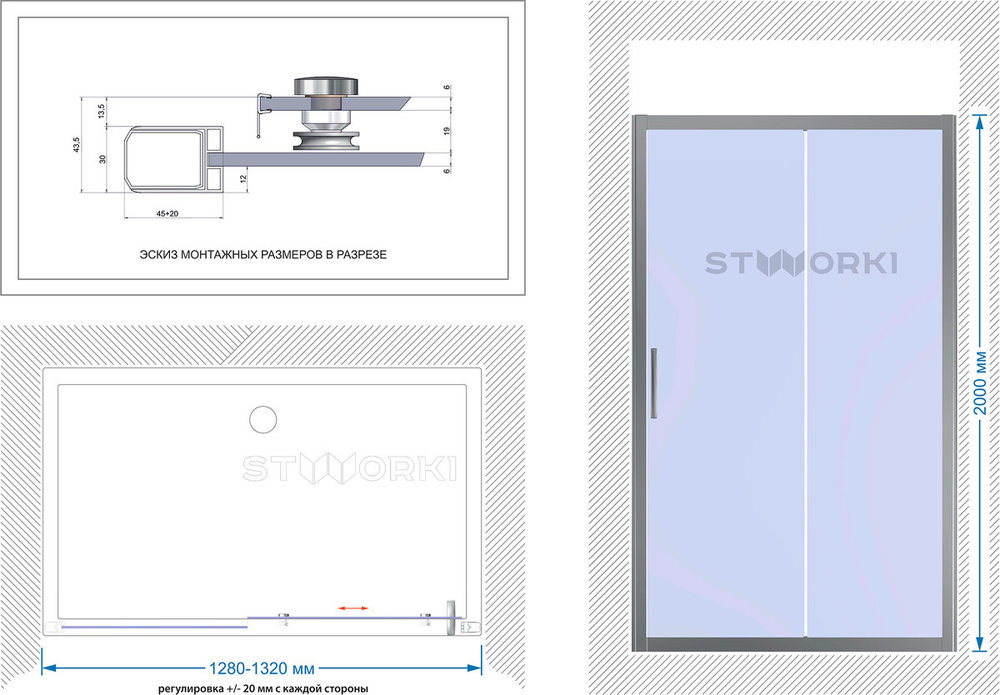Душевая дверь Stworki Стокгольм DE019D2130200 130 см, раздвижная, профиль черный матовый, стекло матовое, 3GW227TTKK000
