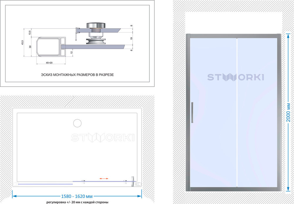 Душевая дверь Stworki Стокгольм DE019D2160200 160 см, профиль хром матовый, стекло матовое, 3GW222TTKK000