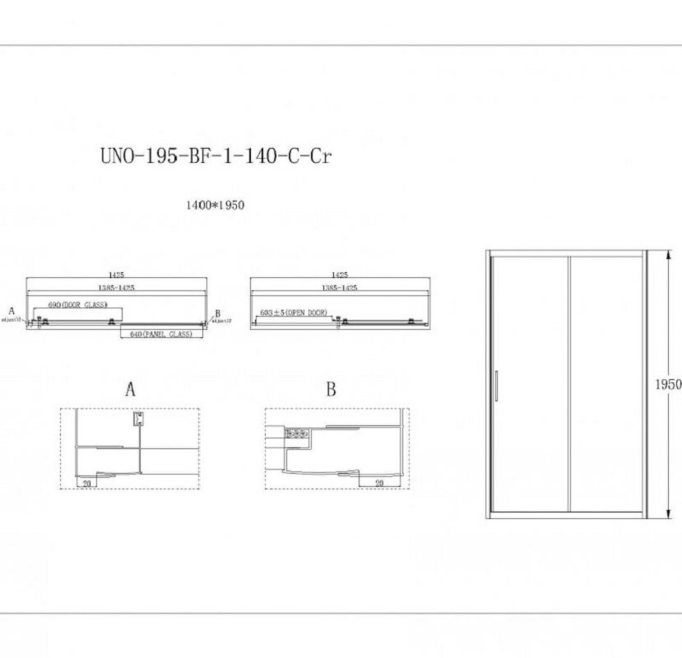 Душевая дверь в нишу BelBagno Uno-195, 140 х 195 см, профиль хром, стекло прозрачное/рифлёное