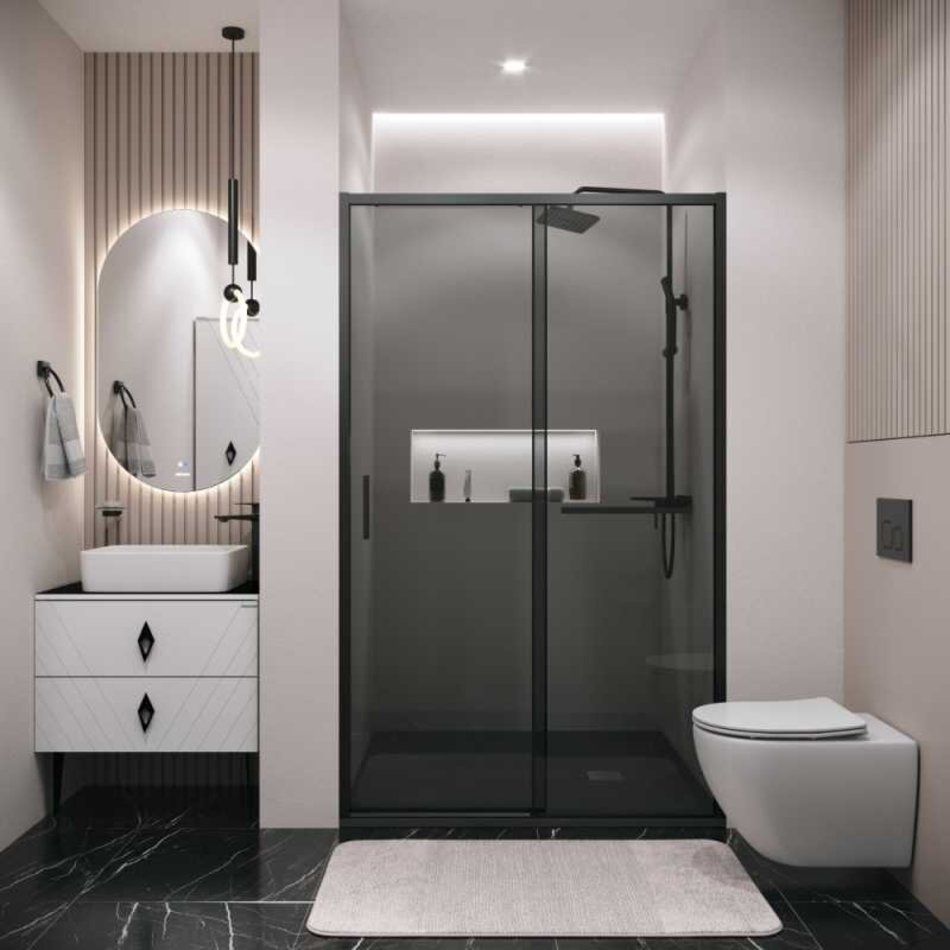 Душевая дверь с монтажом либо в нишу, либо к боковой стенке для формирования душевого уголка.