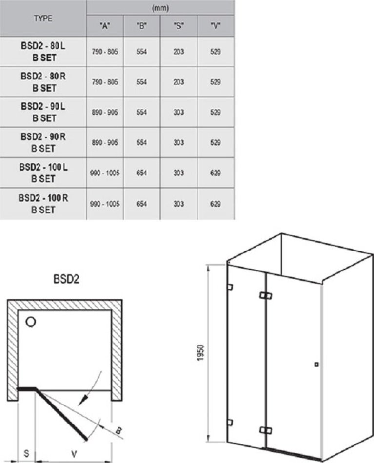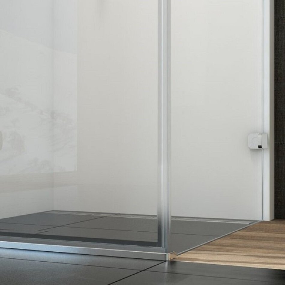 Душевые двери BSD2 поставляются в составе: неподвижная стенка и дверь из безопасного стекла толщиной 8 мм и 6 мм соответственно + пороговая планка - в одной упаковке.