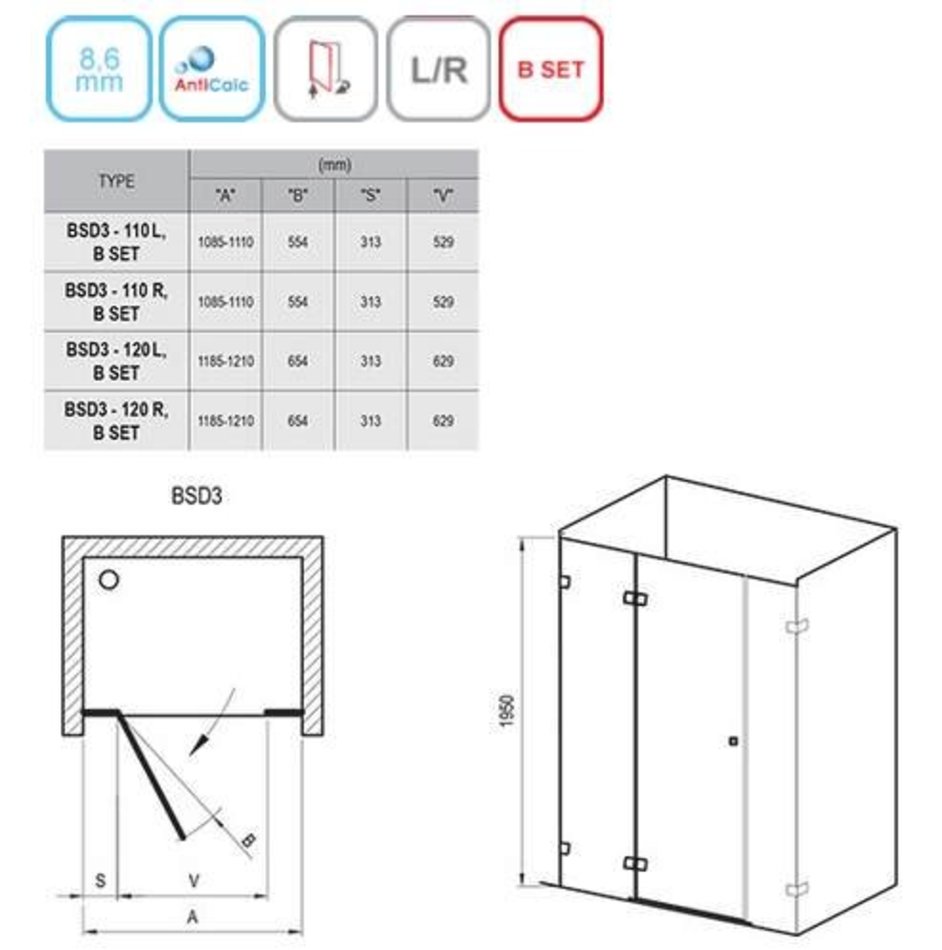 Левый или правый варианты открывания дверей определяются тем, на какой стороне, при виде снаружи, находятся петли. Левый вариант душевого уголка сочетается только с B SET в левом исполнении. Устанавливается в облицованный кафелем угол ванной комнаты (в облицованную нишу) на поддоны RAVAK GIGANT PRO, GIGANT PRO FLAT, GIGANT PRO CHROME или непосредственно на пол со встроенным душевым каналом или трапом.