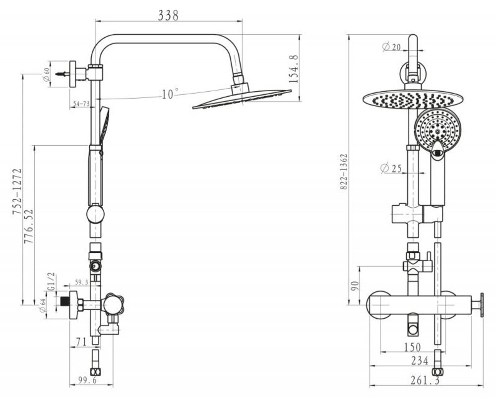 Оснащение: эксцентрики, дивертор, душевой шланг, душевая лейка, верхний душ.