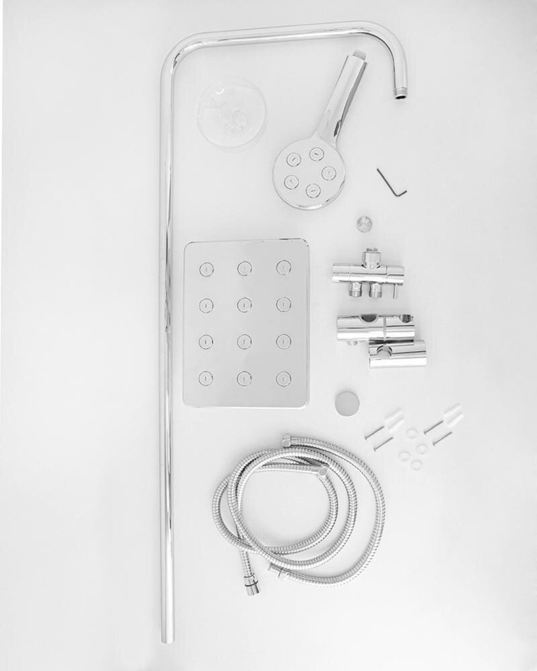Душевая система Orange S12cr включает верхний и ручной душ, шланг 150 см, крепежи, керамический дивертор и небольшую мыльницу, которую можно закрепить прямо на держателе. Верхний душ прямоугольной формы (250*190 мм) имеет двенадцать форсунок для подачи комфортного потока воды. Ручной душ диаметром 110 мм имеет 4 форсунок необычной формы, что обеспечивает равномерный рассеянный поток воды с эффектом тропического ливня.