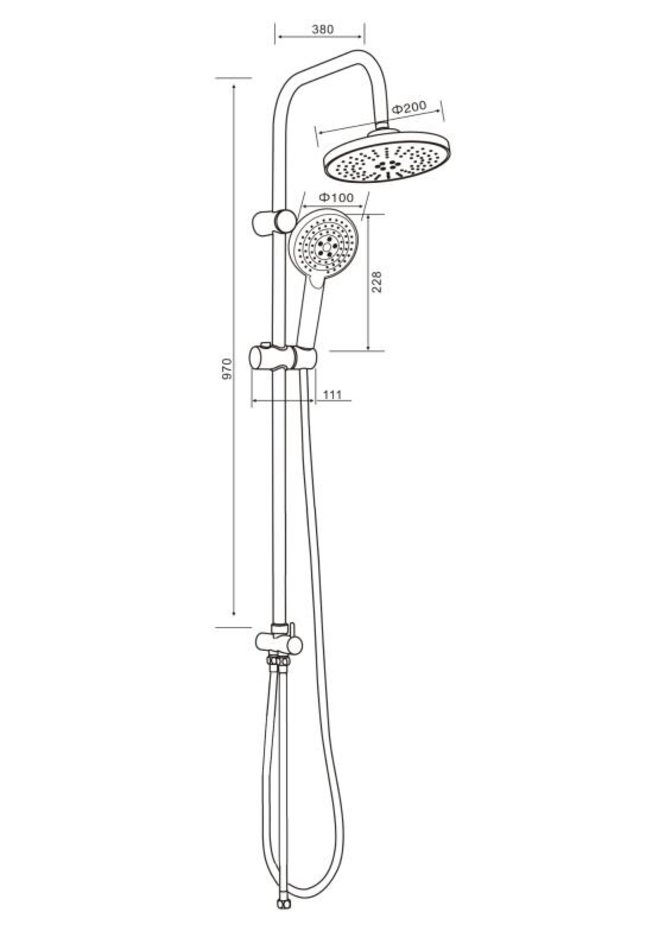 Комплектация: верхний душ, шланг для душа, душевая лейка, душевая штанга, держатель лейки, держатель штанги, переключатель потоков, к-т креплений, инструкция