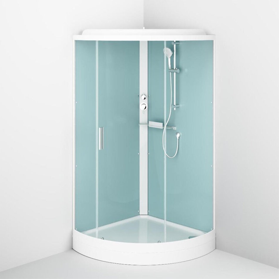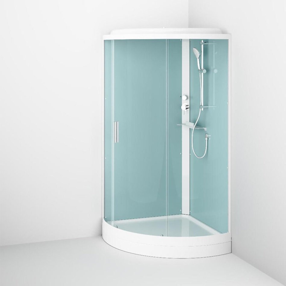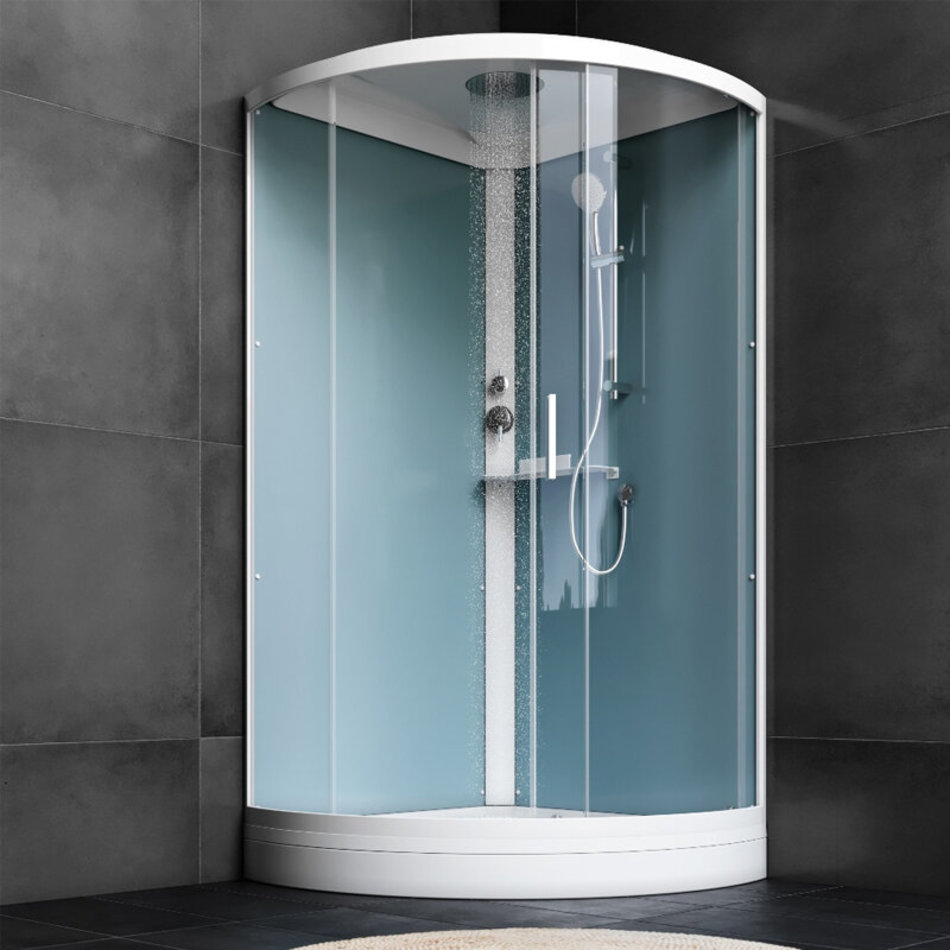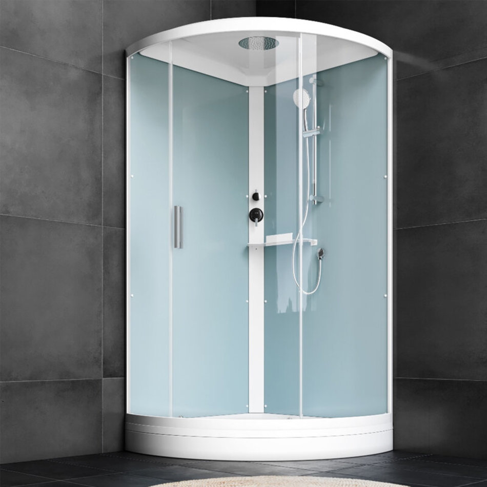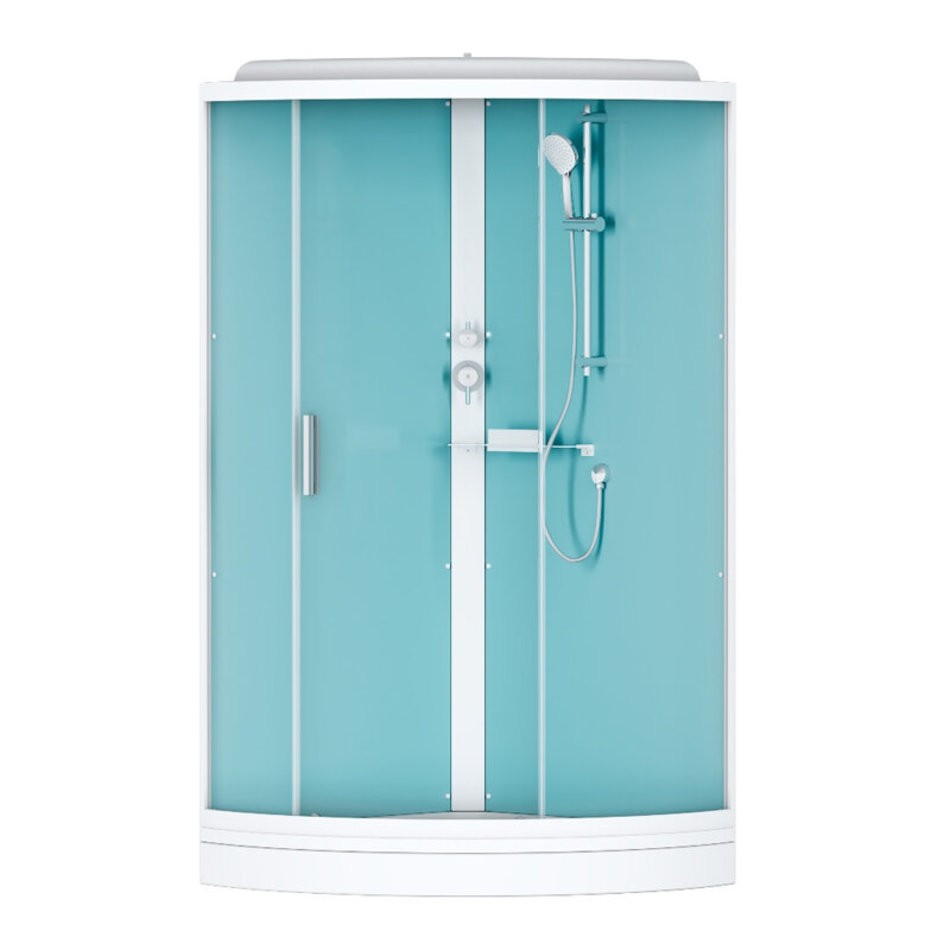 Качественные комплектующие: двойные металлические ролики, верхний душ, ручной душ с держателем с изменяемым углом наклона, удобная функциональная полка.