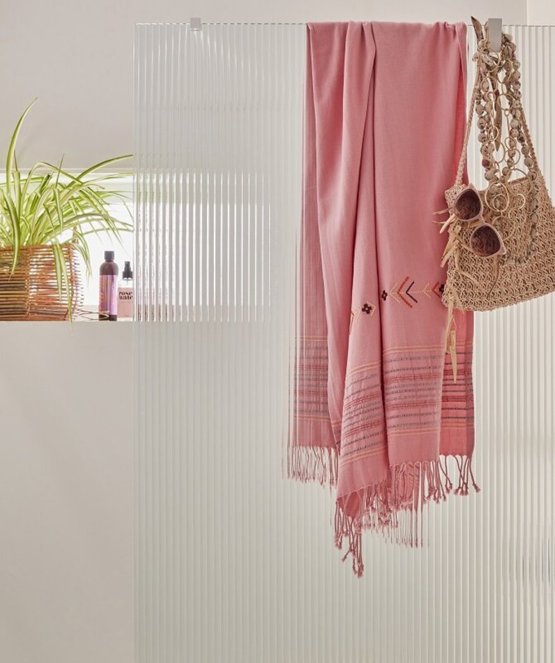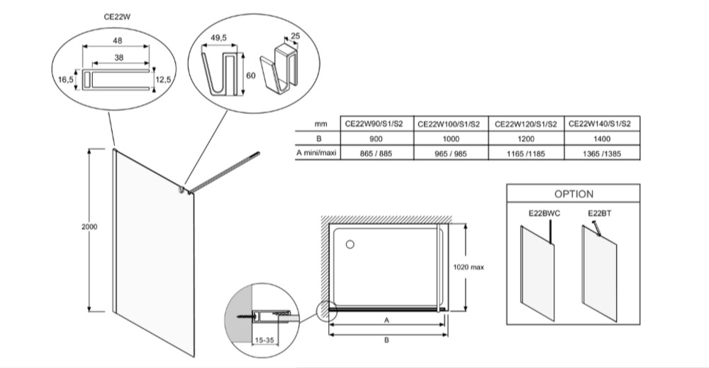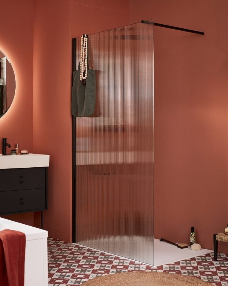 Неподвижная стенка 120 см – рифленое стекло. Профиль приобретается отдельно. Доступен в хромированном, матовом черном цвете, матовой латуни и матовом белом цвете.