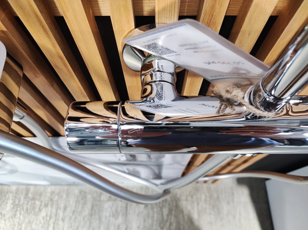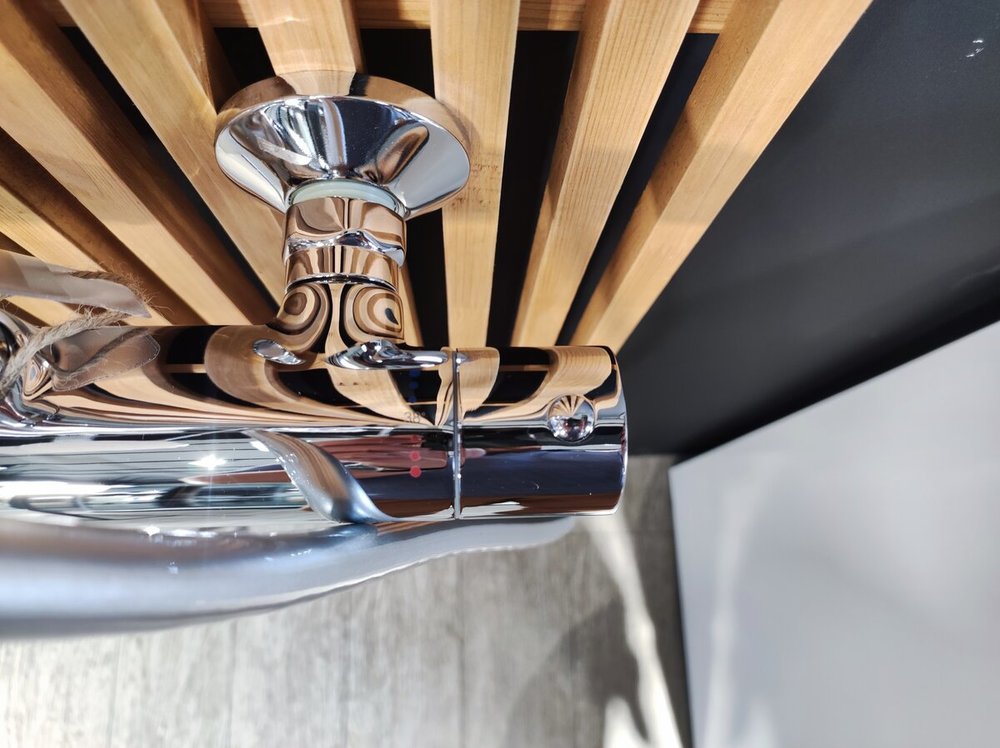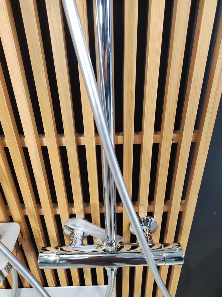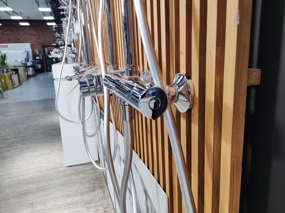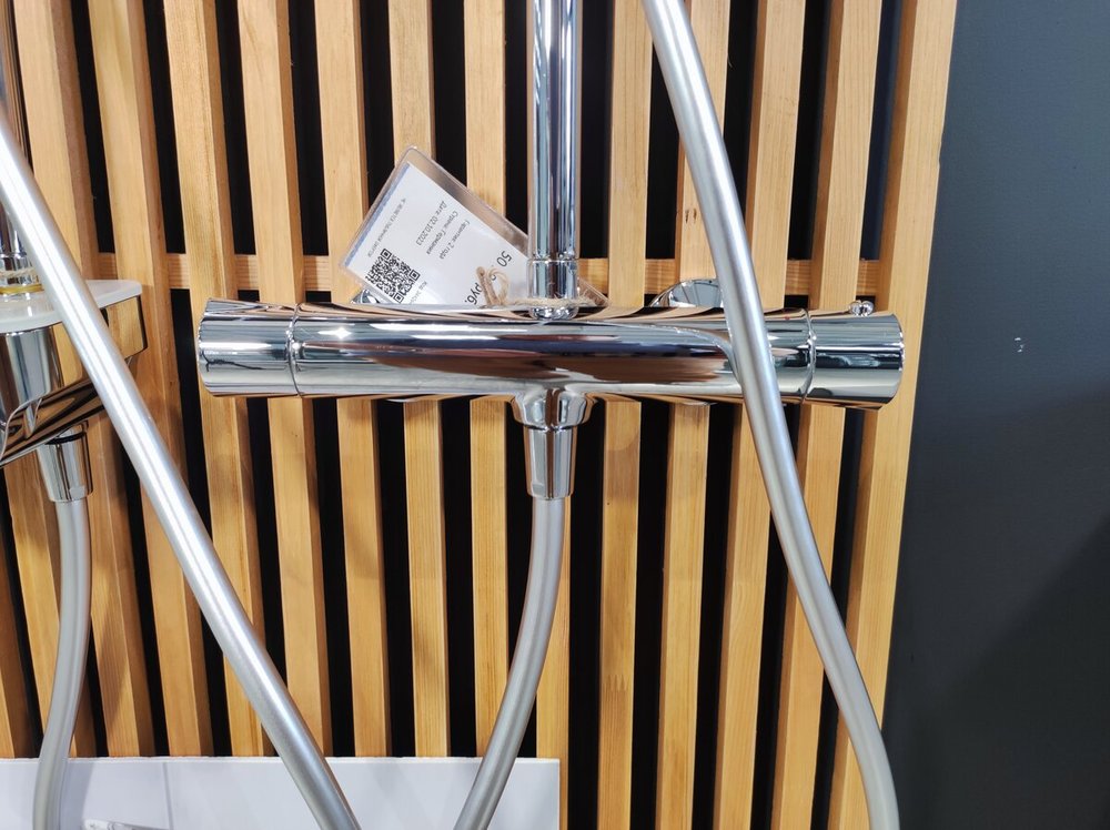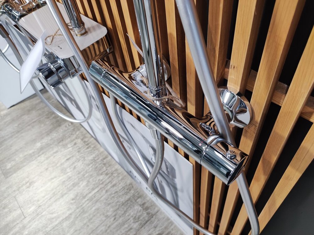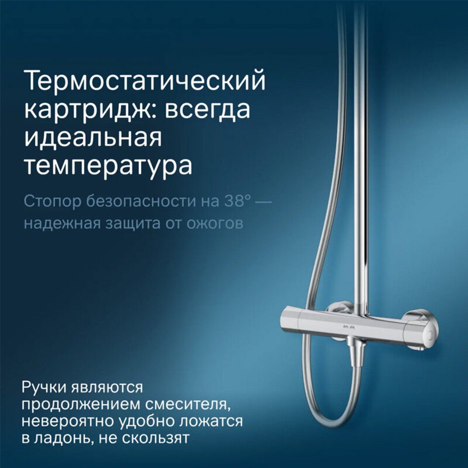 Смеситель для душа с термостатом: термостатический картридж с высокочувствительным термоэлементом, стопором безопасности на 38 градусов, быстрой реакцией на изменения температуры или давления надежно защищает от ожога даже при внезапном отключении холодной воды.