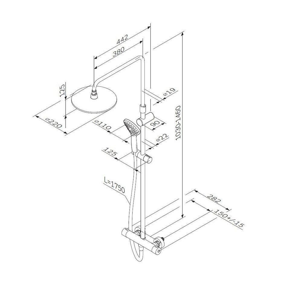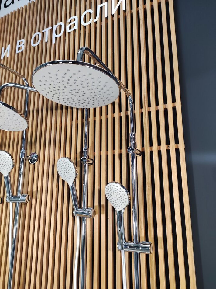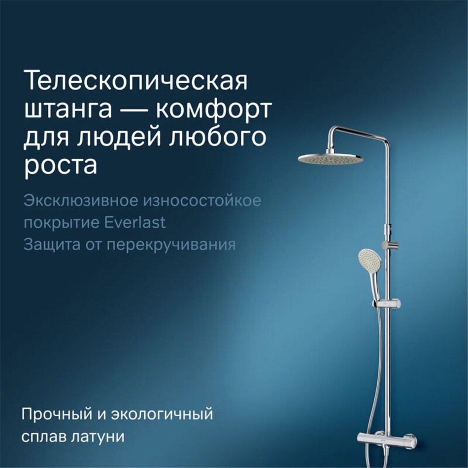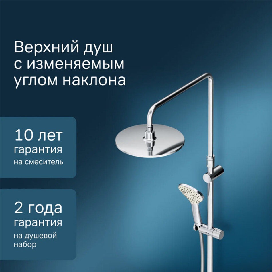 Продуманные детали для удобства использования: штанга регулируется по высоте в диапазоне от 1 030 до 1 460 мм, обеспечивая комфорт для людей любого роста, шаровый шарнир в держателе верхнего душа позволяет регулировать угол его наклона, душевой шланг 1750 мм, верхний душ диаметром 220 мм, ручной душ диаметром 110 мм.