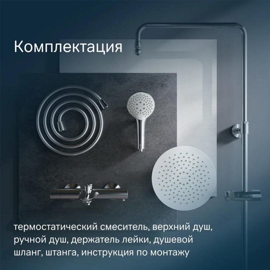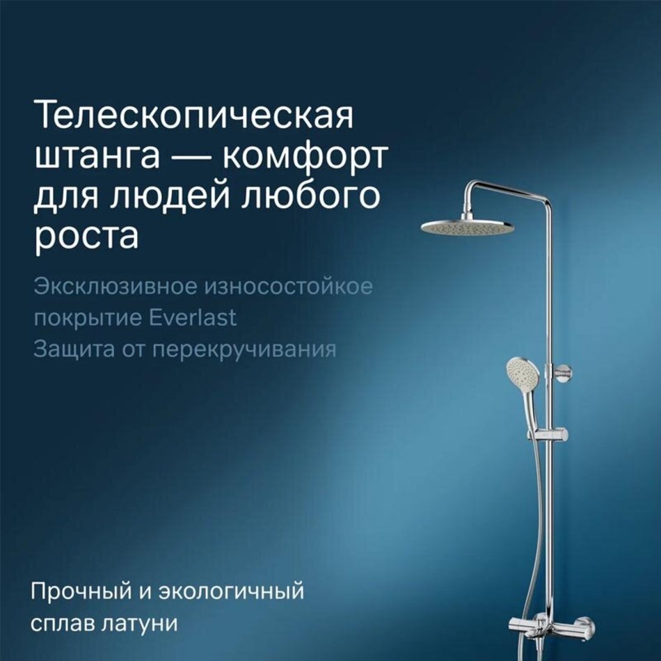 Продуманные детали для удобства использования: штанга регулируется по высоте в диапазоне от 1030 до 1460 мм, обеспечивая комфорт для людей любого роста, шаровой шарнир в держателе верхнего душа позволяет регулировать угол его наклона, душевой шланг 1750 мм, верхний душ диаметром 220 мм, ручной душ диаметром 110 мм.