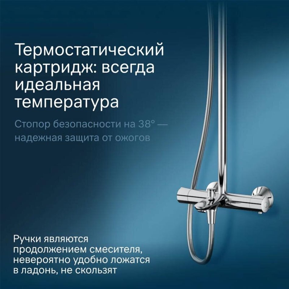 Смеситель для ванны и душа с термостатом: термостатический картридж с высокочувствительным термоэлементом, стопором безопасности на 38 градусов, быстрой реакцией на изменения температуры или давления надежно защищает от ожога даже при внезапном отключении холодной воды.