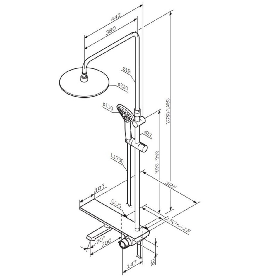 Продуманные детали для максимального удобства использования: телескопическая штанга регулируется по высоте в диапазоне от 1030 до 1460 мм, обеспечивая комфорт для людей любого роста, душевой шланг 1750 мм с защитой от перекручивания, увеличенный верхний душ диаметром 220 мм, ручной душ диаметром 120 мм.