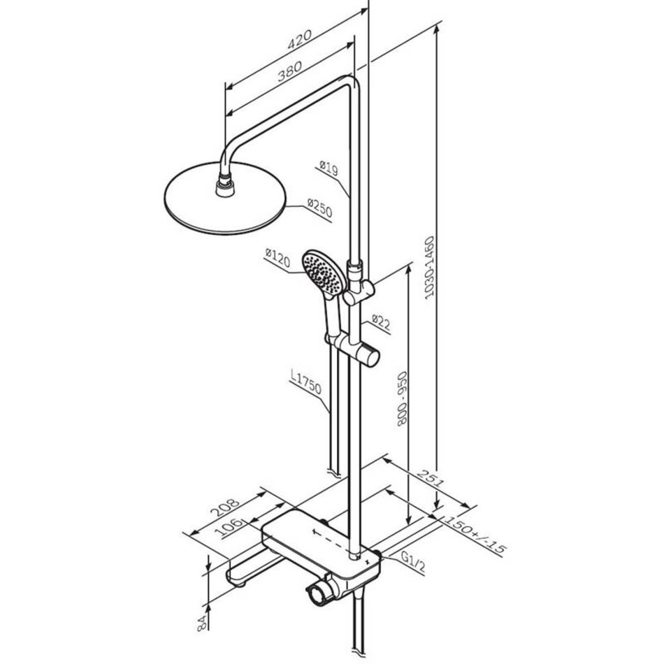 Телескопическая поворотная штанга регулируется по высоте в диапазоне от 1030 до 1460 мм обеспечивая комфорт для людей любого роста а шаровой шарнир в держателе верхнего душа позволяет регулировать угол его наклона.
