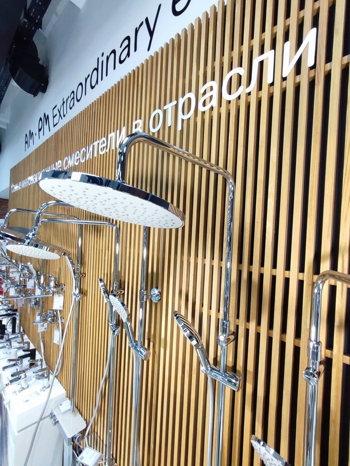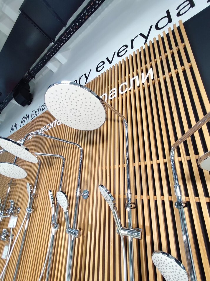 Тотальный дизайн в действии: все детали душевой системы – от пропорций ручного и верхнего душей до рисунка расположения форсунок на лейках.