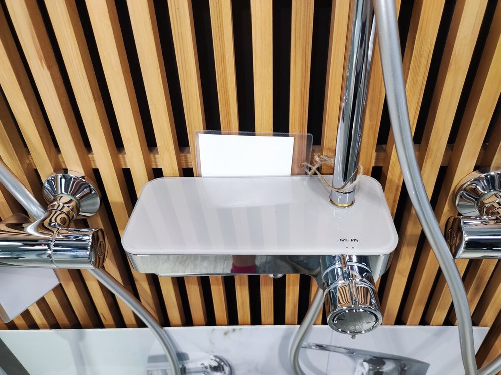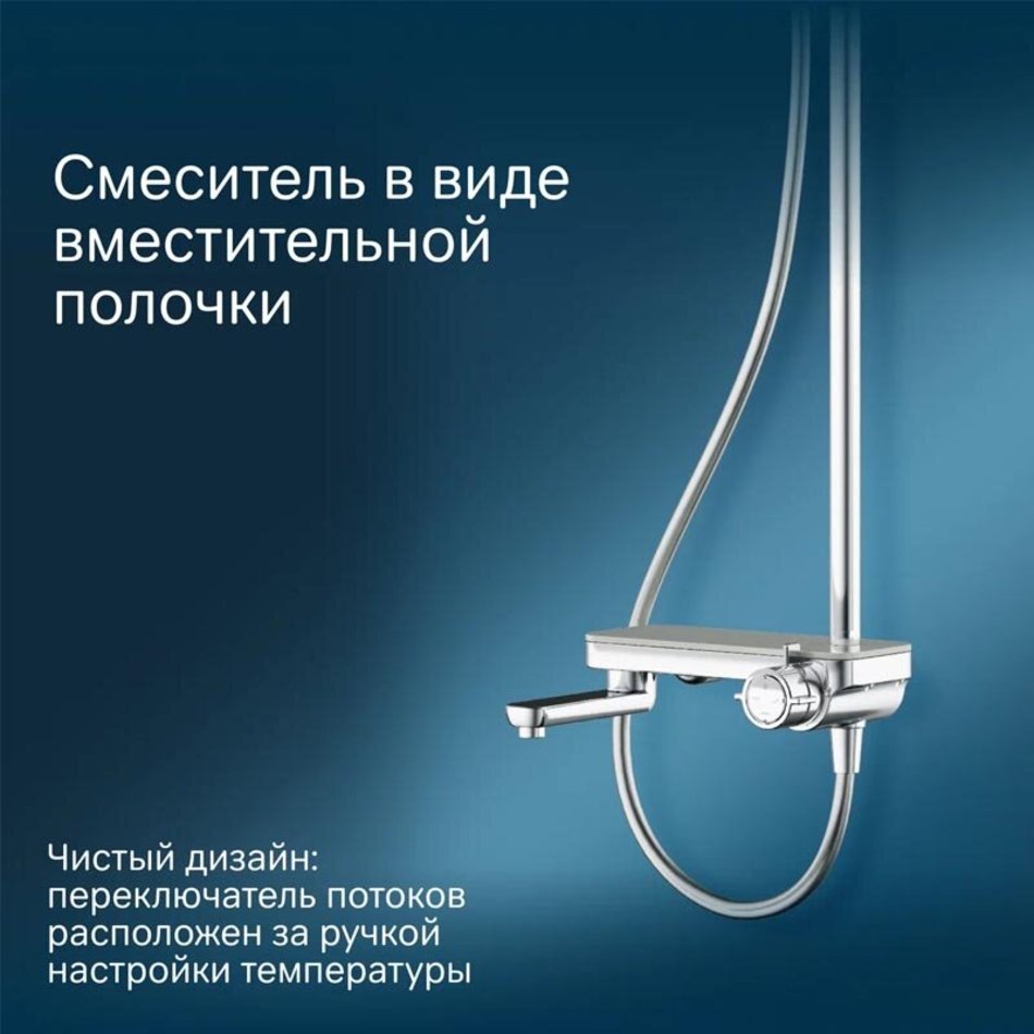 Чистый дизайн без лишних деталей: переключатель расположен за ручкой настройки температуры и позволяет менять источник потока воды от ручной лейки и излива до верхнего душа.