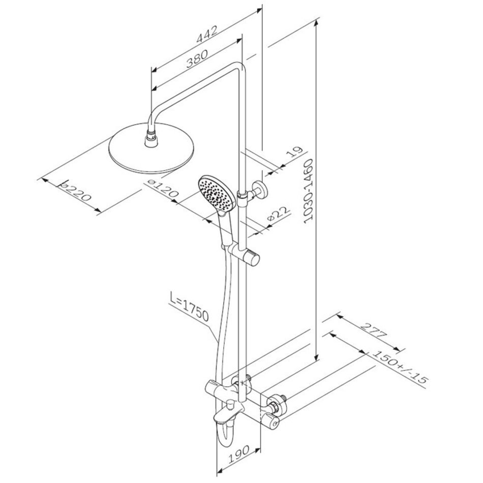 Продуманные детали для удобства использования: штанга регулируется по высоте в диапазоне от 1030 до 1460 мм, обеспечивая комфорт для людей любого роста, шаровой шарнир в держателе верхнего душа позволяет регулировать угол его наклона, душевой шланг 1750 мм, верхний душ диаметром 220 мм, ручной душ диаметром 120 мм.