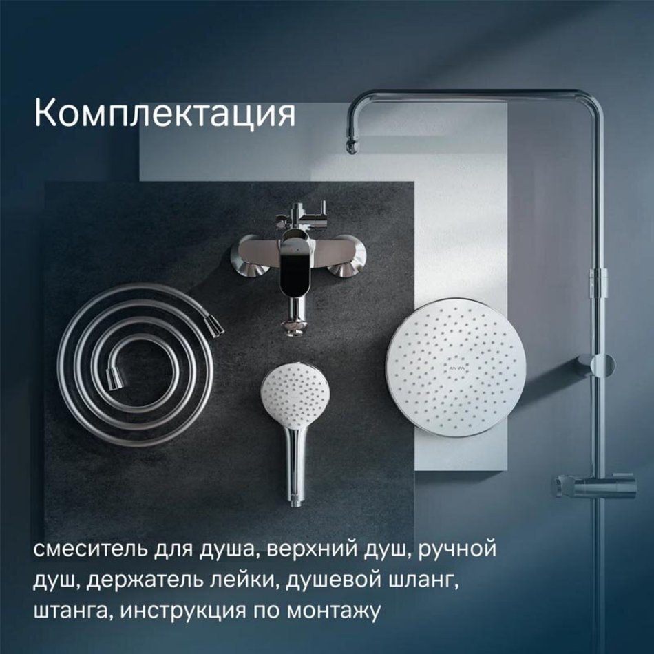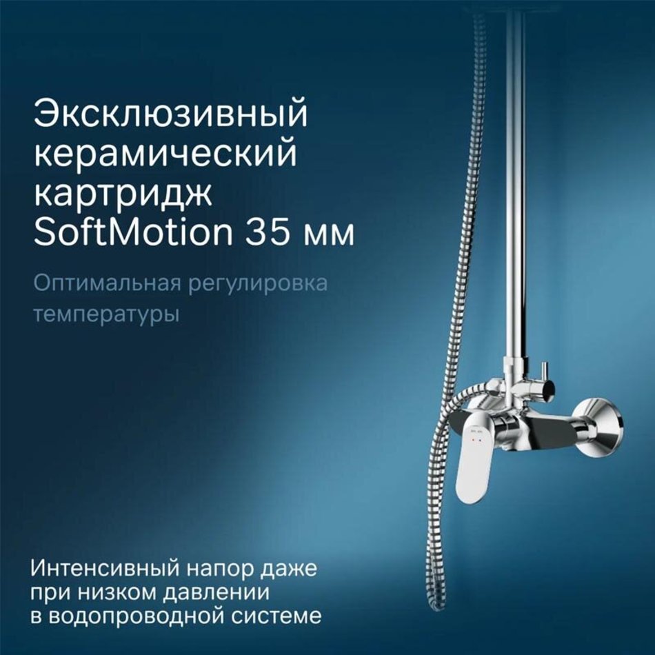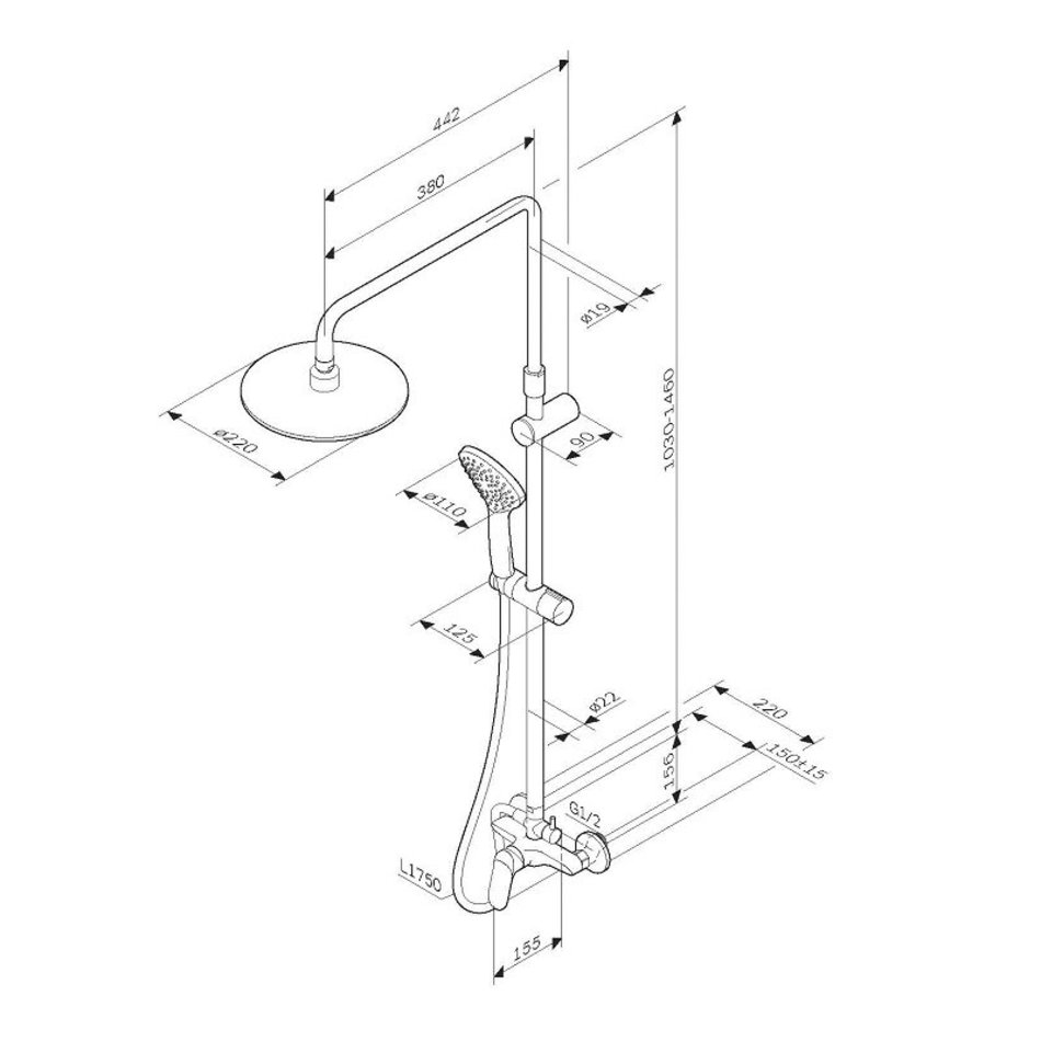 Диаметр душевых леек (верхний душ 220 мм и ручной душ 110 мм) позволит ощутить преимущества тропического душа даже в стандартной ванной, тогда как увеличенная длина шланга 1750 мм обеспечит свободу движений во время принятия душа. Продуманные детали для удобства использования: телескопическая поворотная штанга регулируется по высоте в диапазоне от 1030 до 1460 мм, обеспечивая комфорт для людей любого роста.