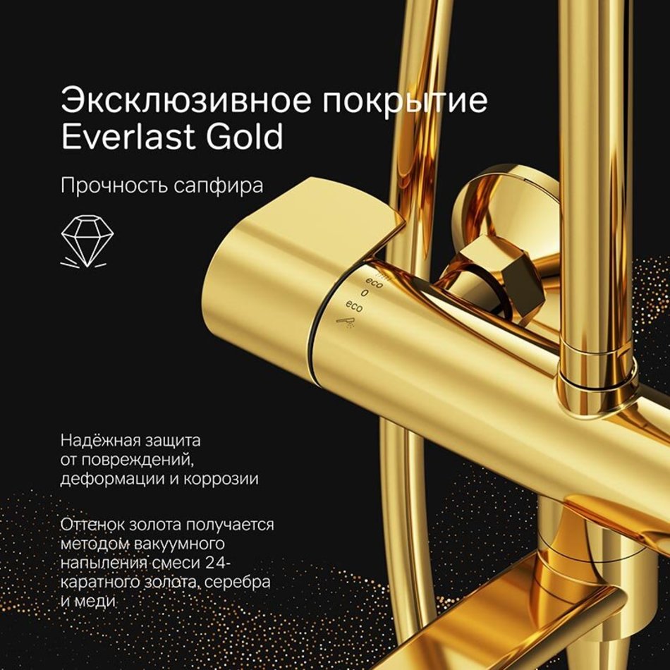 Новое прочтение культовой коллекции X-Joy. Еще больше инновационных решений для вашей ванной комнаты. Трендовые формы, технологичные материалы и продуманные детали, которые теперь доступны каждому. По самой привлекательной цене. Настоящее произведение ювелирного искусства в вашей ванной комнате: корпус душевой системы равномерно покрыт тончайшим слоем 24-каратного золота. Нанесение драгоценного финишного слоя выполнено методом вакуумного напыления, в процессе которого микрочастицы золота образуют стойкое соединений с латунной основой. Прочность эксклюзивного покрытия Everlast Gold сравнима с прочностью сапфира.