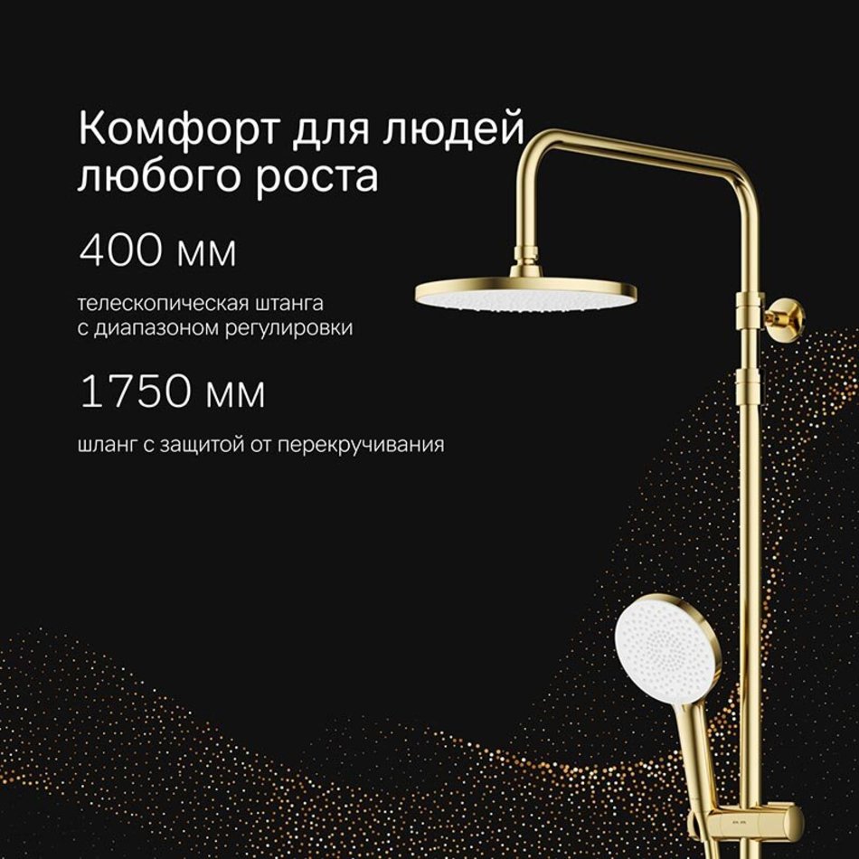 Телескопическая штанга с диапазоном регулировки 400 мм сделает процесс принятия душа удобным для людей любого роста. А благодаря увеличенным размерам тропического (220 мм) и ручного (120 мм) душей вы ощутите все преимущества использования дизайнерского продукта.