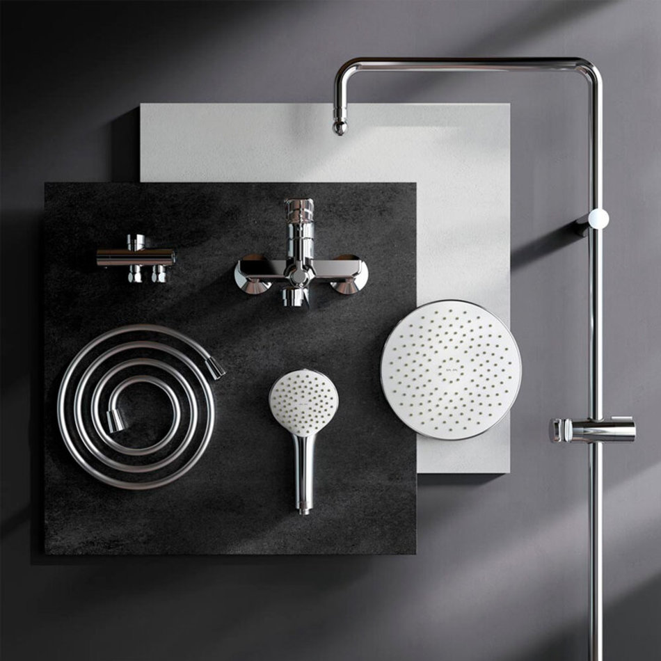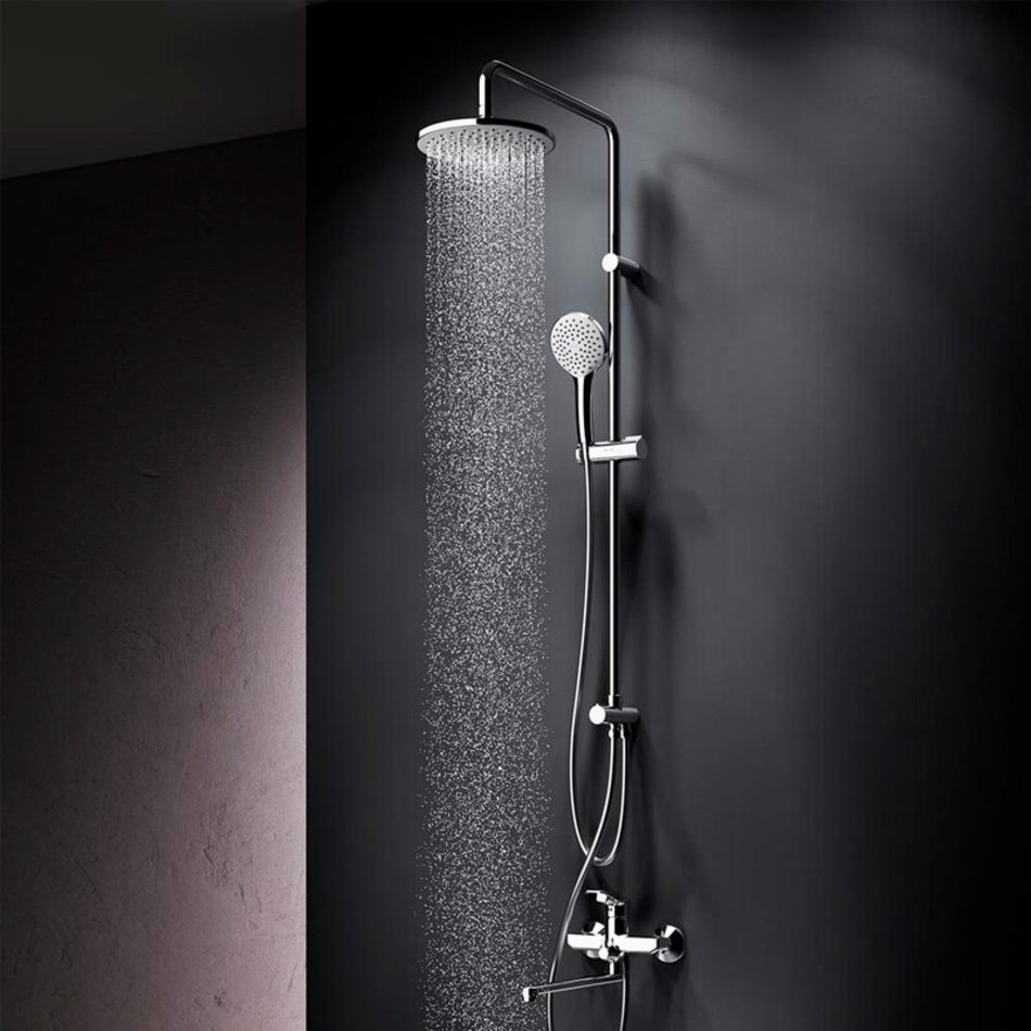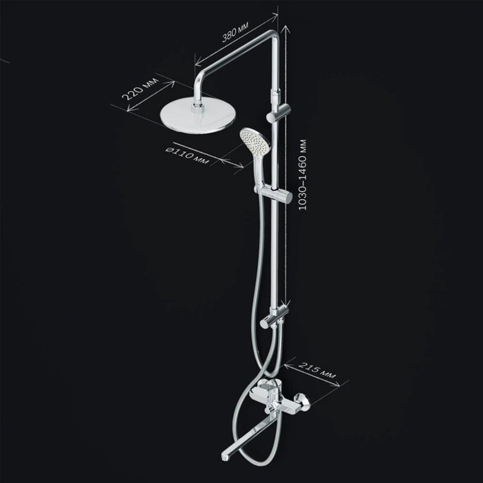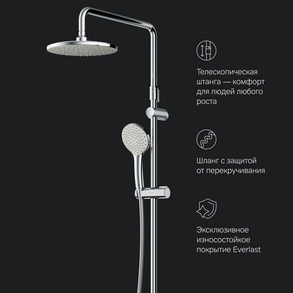 Легкость и простота установки душевой системы. Регулируемая штанга душа по высоте от 1030 до 1460 мм позволит установить верхний душ индивидуально под свой рост. Технология Rub&Clean поддерживает чистоту форсунок. Проведите один раз пальцем по поверхности и форсунки станут чистыми. Увеличенный диаметр верхнего и ручного душа помогут ощутить преимущества дизайнерской душевой системы. Душевой шланг длиной 1750мм с защитой от перекручивания даст возможность свободно чувствовать себя при принятии душа.