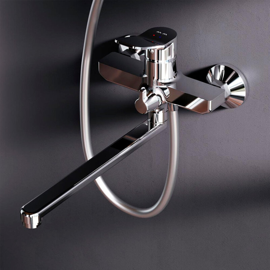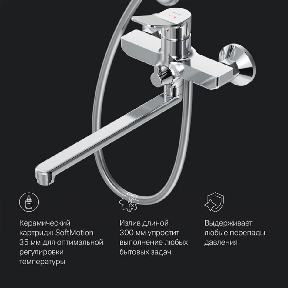 Смеситель для ванны и душа оснащен керамическим картриджем Soft Motion 35мм, который обеспечивает оптимальную регулировку температуры, а также выдерживает перепады давления. Излив длиной 300мм облегчит выполнение бытовых задач.