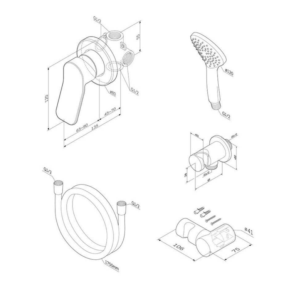 Смеситель для душа, лейка, шланг, держатель ручного душа, шланговое присоединение, крепеж, инструкция