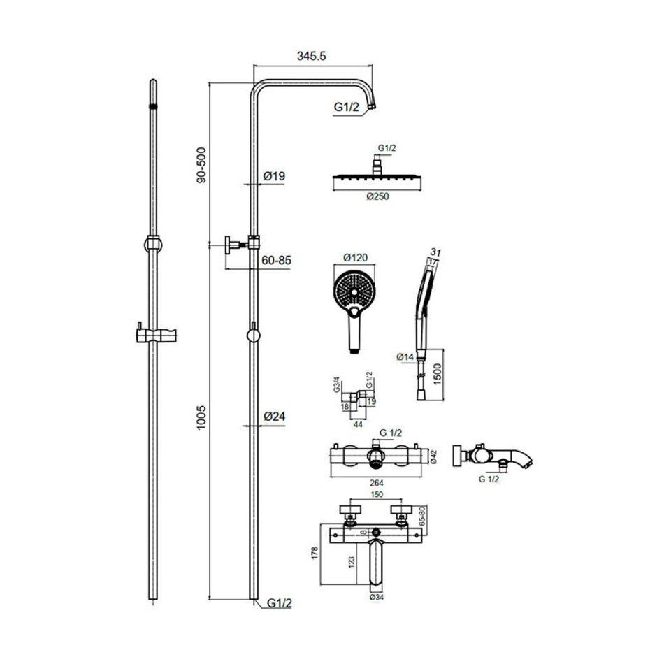 Состоит из: верхний душ, ручной душ, термостатический смеситель для душа, излив, штанга для душа, держатель для душа.