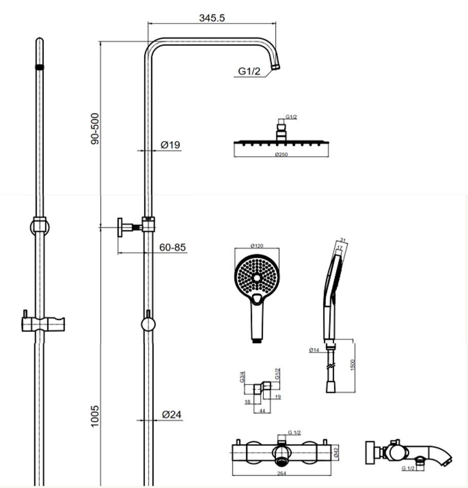 Состоит из: верхний душ, ручной душ, термостатический смеситель для душа, излив, штанга для душа, держатель для душа.