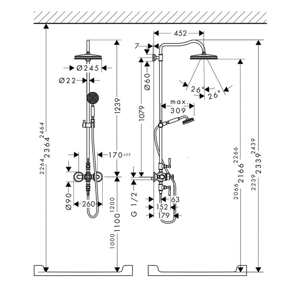 - Верхний душ 1jet - 240 мм, регулируемый угол верхнего душа