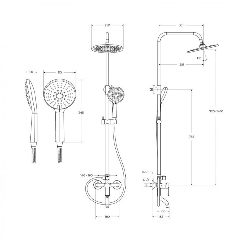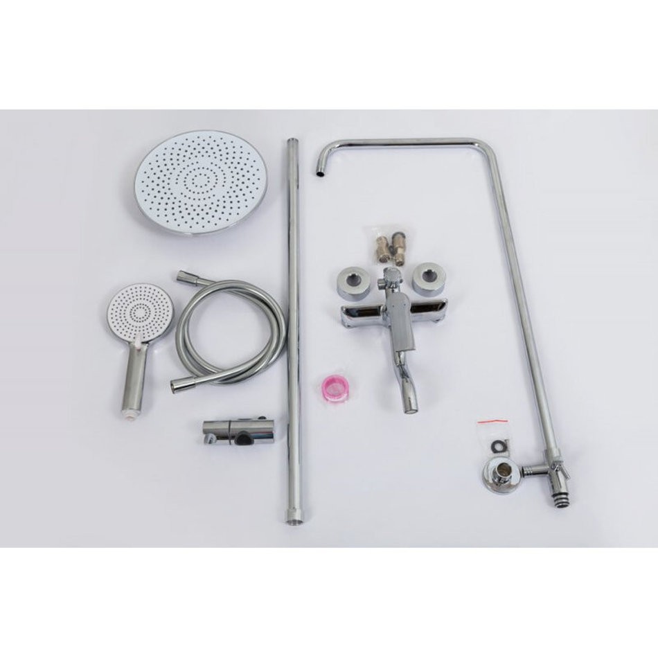 - Оснащение: эксцентрики, переключатель потоков, душевой шланг ПВХ длиной 150 см, ручной душ 3-х режимный, верхний душ, смеситель с поворотным изливом