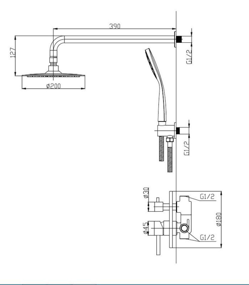 - Комплектация: смеситель, верхний душ, душевая лейка, держатель лейки, душевой шланг, крепления