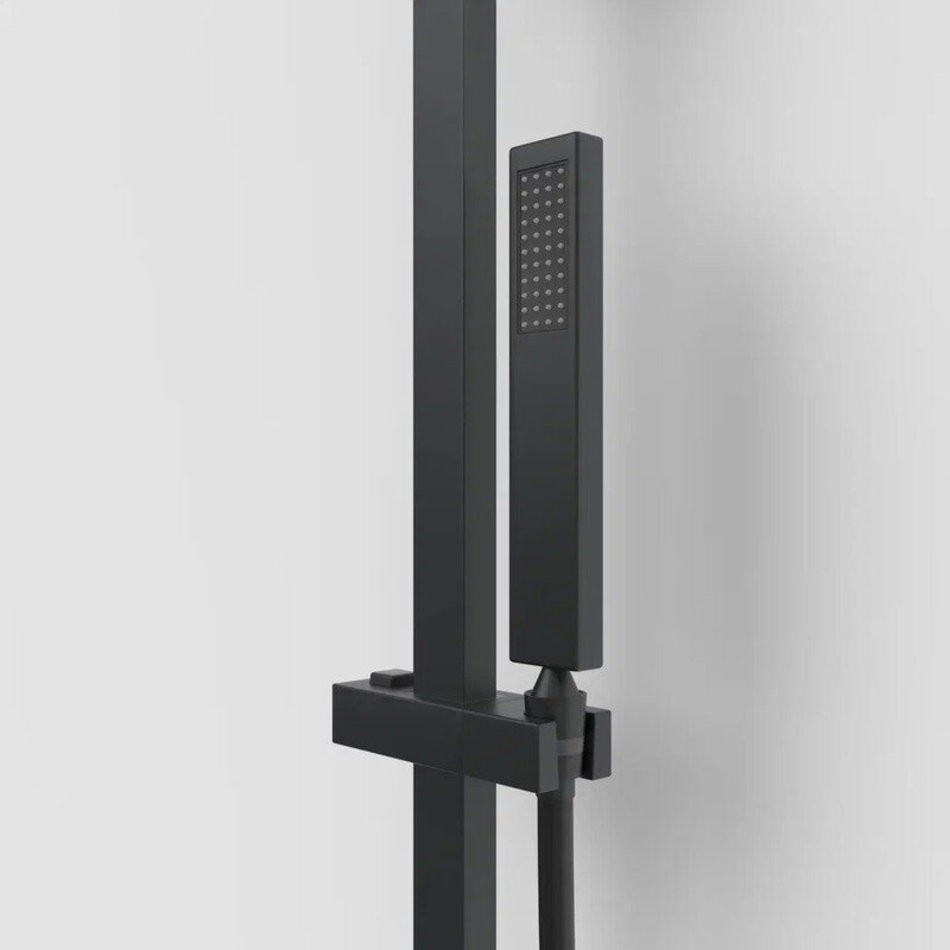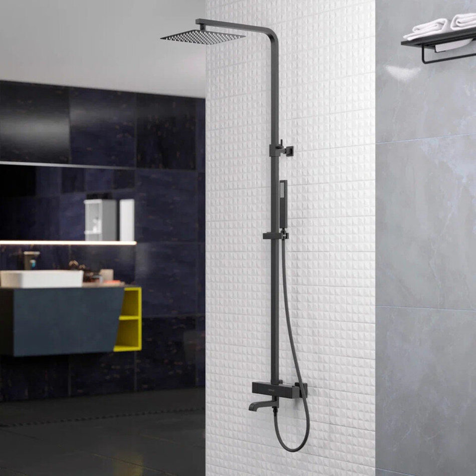 Термостатическое управление температурой воды поднимет уровень комфорта и удовольствия на новый уровень, а надежная механическая блокировка регулятора, заданная на значении 38 градусов, убережет от случайного повышения температуры. Лейка верхнего душа имеет инновационную систему самоочистки в виде гибких силиконовых вставок на форсунках душа, которые защищают изделие от известковых отложений. Верхний душ изготовлен из нержавеющей стали. Ручной душ – из ABS пластика. Оба душа имеют черное матовое покрытие, которое выглядит безупречно на протяжении всего периода эксплуатации.