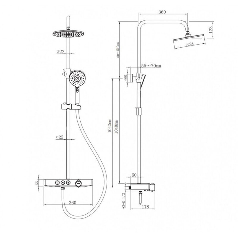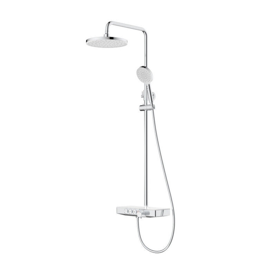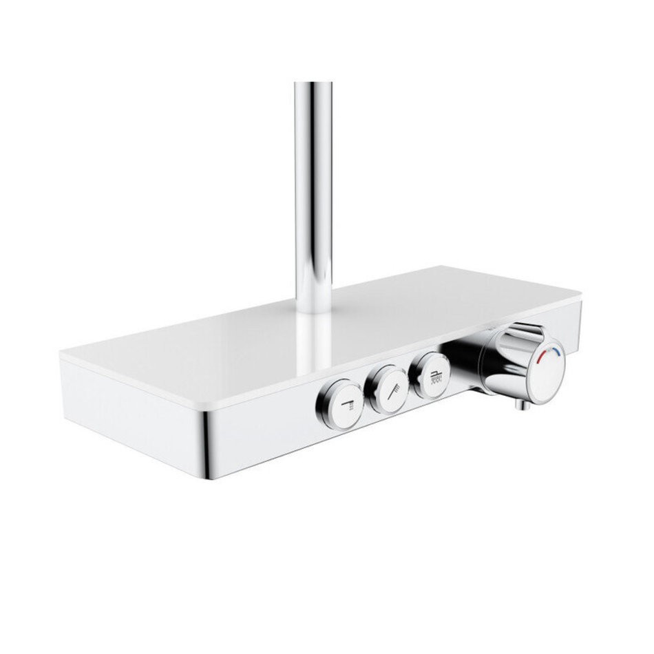 Форма корпуса смесителя выполнена в виде полочки из закаленного стекла, позволяя комфортно хранить необходимые принадлежности для душа. Регулируемая стойка выполнена из нержавеющей 201 стали с гальваническим покрытием.