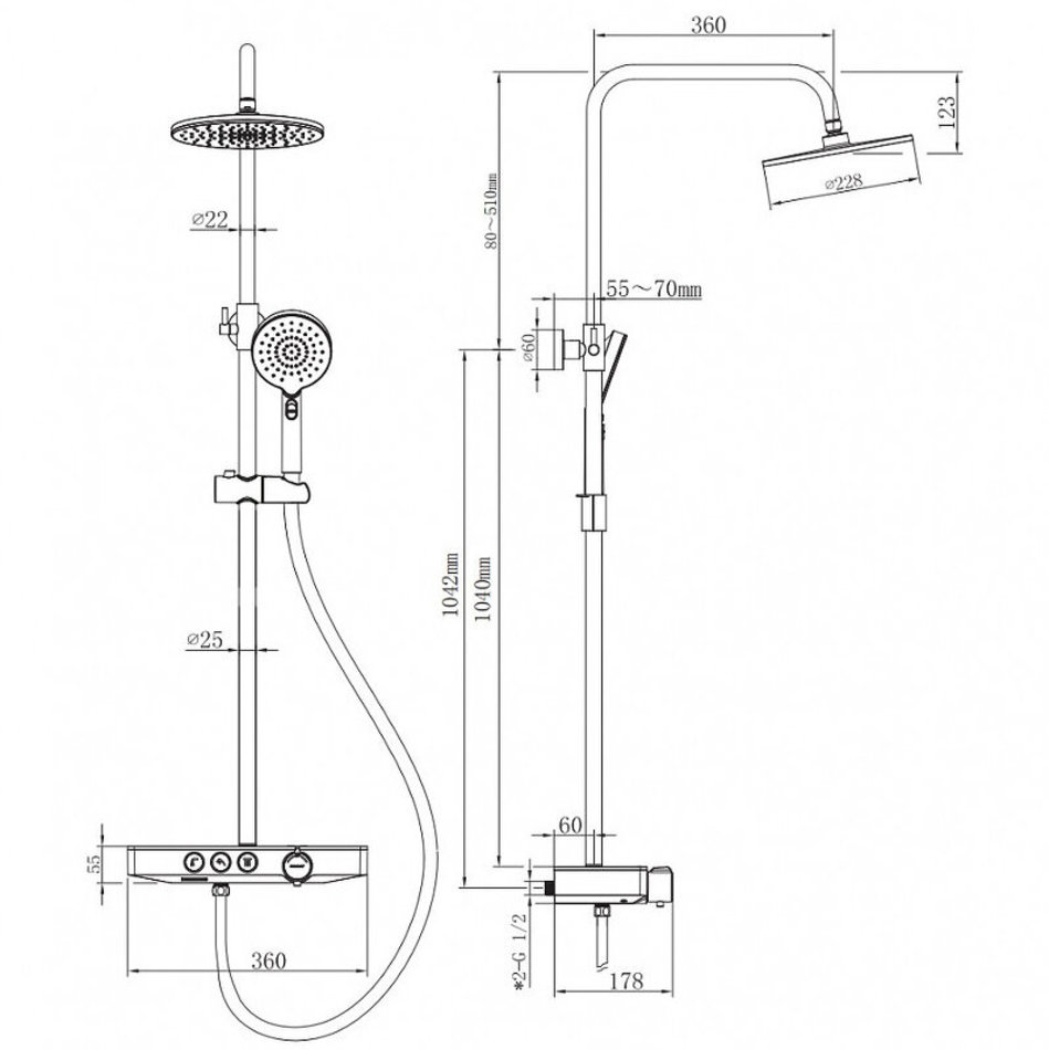 Форма корпуса смесителя выполнена в виде полочки из закаленного стекла, позволяя комфортно хранить необходимые принадлежности для душа. Регулируемая стойка выполнена из нержавеющей 201 стали с гальваническим покрытием.
