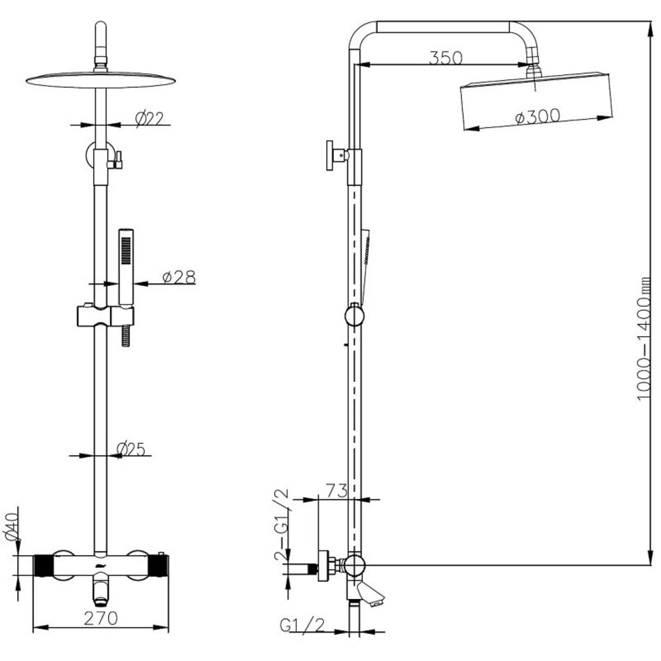 - Регулируемый размер душевой штанги: 1000-1400 мм.