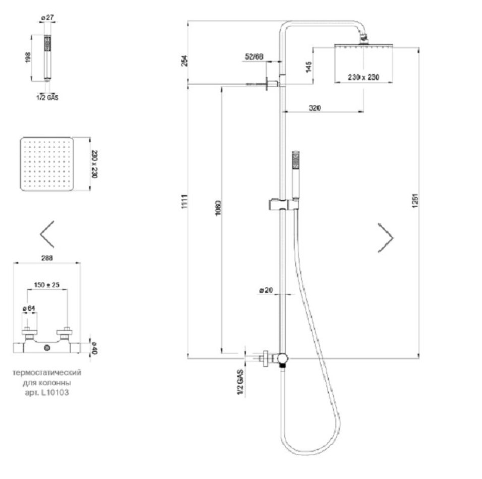 Душевая система Bossini Cosmo L10103.073 с термостатом, верхний душ квадратный, цвет черный матовый